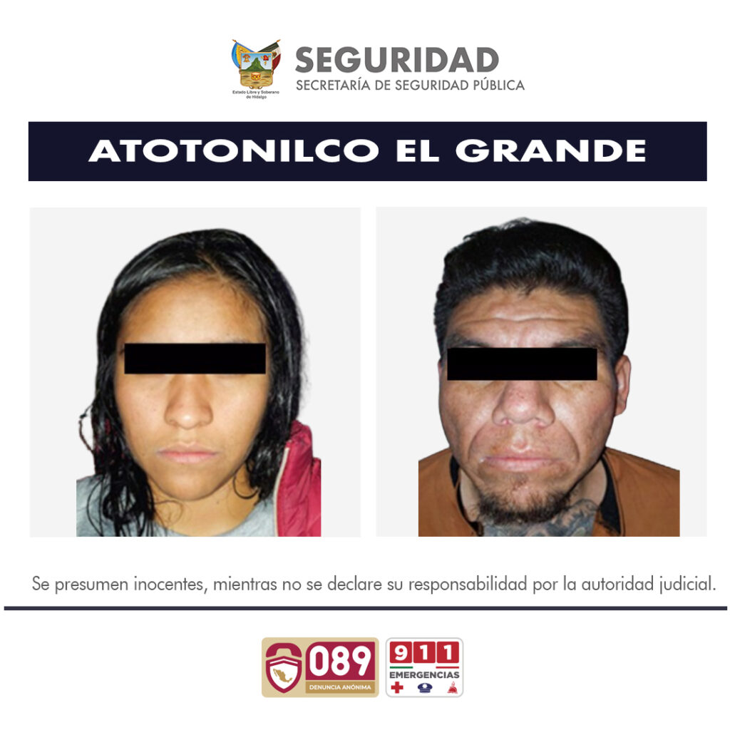 En tanto, en el municipio de Atotonilco El Grande, agentes estatales lograron la detención de un hombre y una mujer identificados con las iniciales R. G. B., alias «El Pecas» y D. A. S. N., a quienes se les aseguraron mil 667 dosis de hierba seca con características de marihuana, 210 dosis de droga sintética “cristal”, dinero en efectivo, equipo de radiocomunicación y tecnológico.