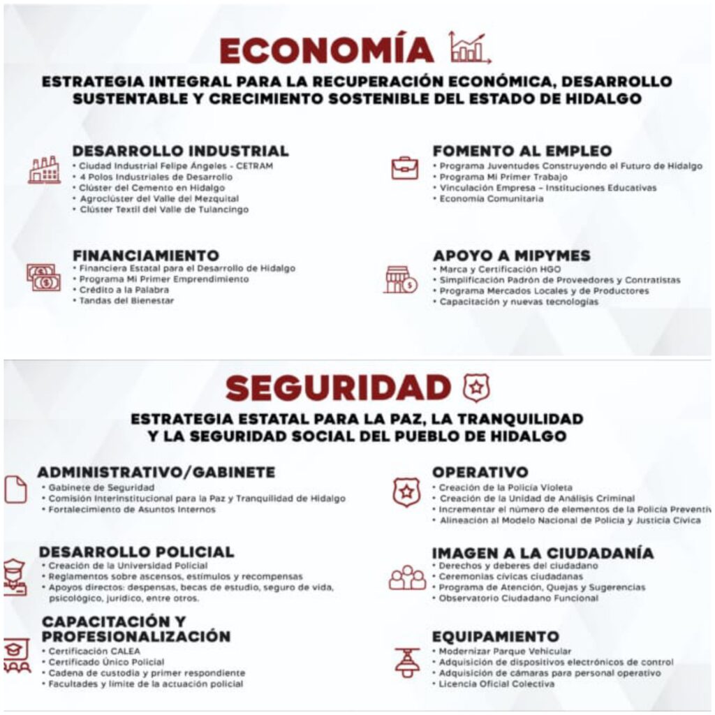 Entre las principales propuestas destacan la generación de un Gabinete de seguridad, así como de una Comisión Interinstitucional para la Paz y la Tranquilidad de Hidalgo, mientras que en el eje Operativo se plantea la creación de la Policía Violeta, organismo que deberá atender los delitos cometidos en contra de las mujeres y que estará integrada por agentes capacitadas en materia de género.