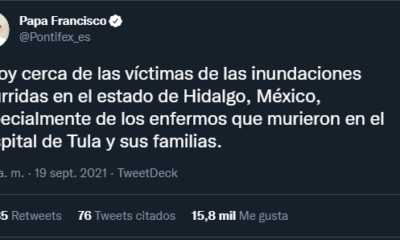 Redacción, 19 de Septiembre.- El papa Francisco mostró su cercanía a los afectados por las inundaciones en México, ocurridas principalmente en Hidalgo, y en especial a...