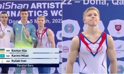 Redacción, 6 de Marzo.- El gimnasta ruso Ivan Kuliak terminó tercero en barras paralelas y apareció en el podio con una “Z” en su indumentaria. A...