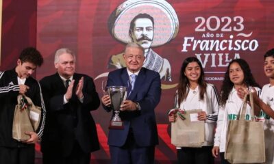 El presidente Andrés Manuel López Obrador (AMLO) y el gobernador de Nuevo León Samuel García, hicieron un reconocimiento público al equipo sub-14 que ganó el Desafío Mundial del Real...
