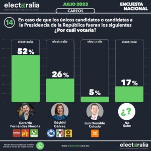 En el caso de que la candidata fuera Claudia Sheinbaum, contra la misma Gálvez el ejercicio comparativo indica que sería un abrumador 57 por ciento contra 26 por ciento en caso de que fuera la candidata la hidalguense.