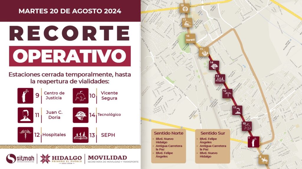 La Secretaría de Movilidad y Transporte informó que debido al cierre de vialidades en la ciudad de Pachuca, hicieron cambios en la Ruta Troncal en sentido Sur. Las estaciones afectadas fueron:
