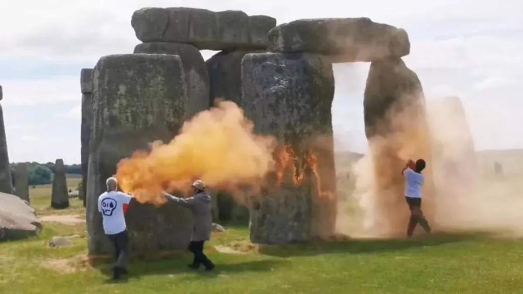 El grupo de protesta de Just Stop Oil declaró que un par de sus activistas, de 21 y 73 años, habían «decorado Stonehenge con pintura en polvo de color naranja» para exigir que el próximo Gobierno del Reino Unido se comprometa legalmente a eliminar gradualmente los combustibles fósiles para 2030.