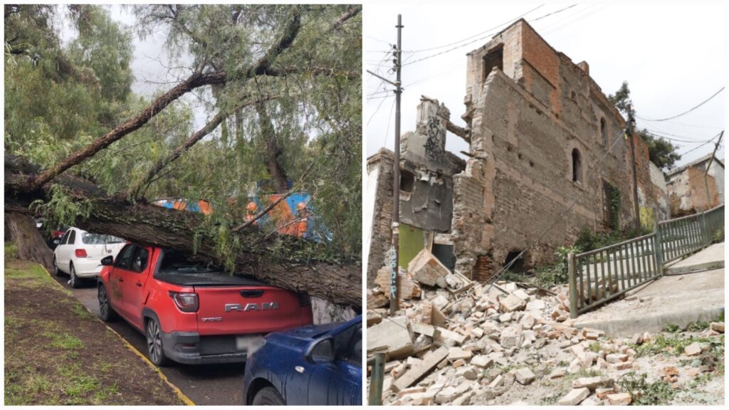 El desplome de una antigua construcción y la caída de un árbol sobre un vehículo, fueron dos hechos que se registraron este viernes en el municipio de Pachuca.